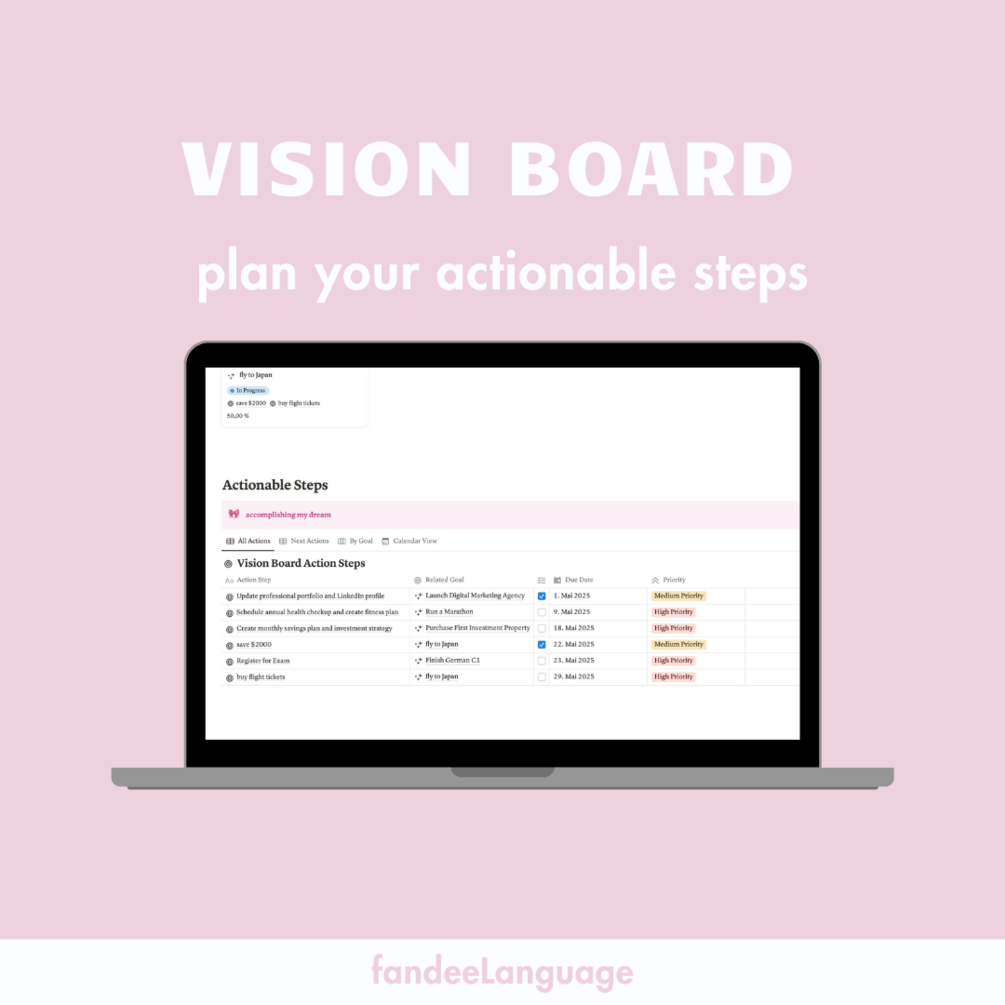 -> This template includes a simple goal setting system. You can write down your vision and break it into actionable steps with deadlines. Like this, you can achieve your visions easily :)